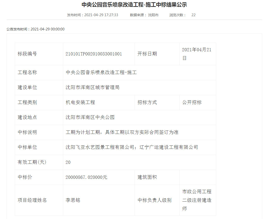恭喜中標(biāo)沈陽(yáng)中央音樂(lè)噴泉改造工程項(xiàng)目